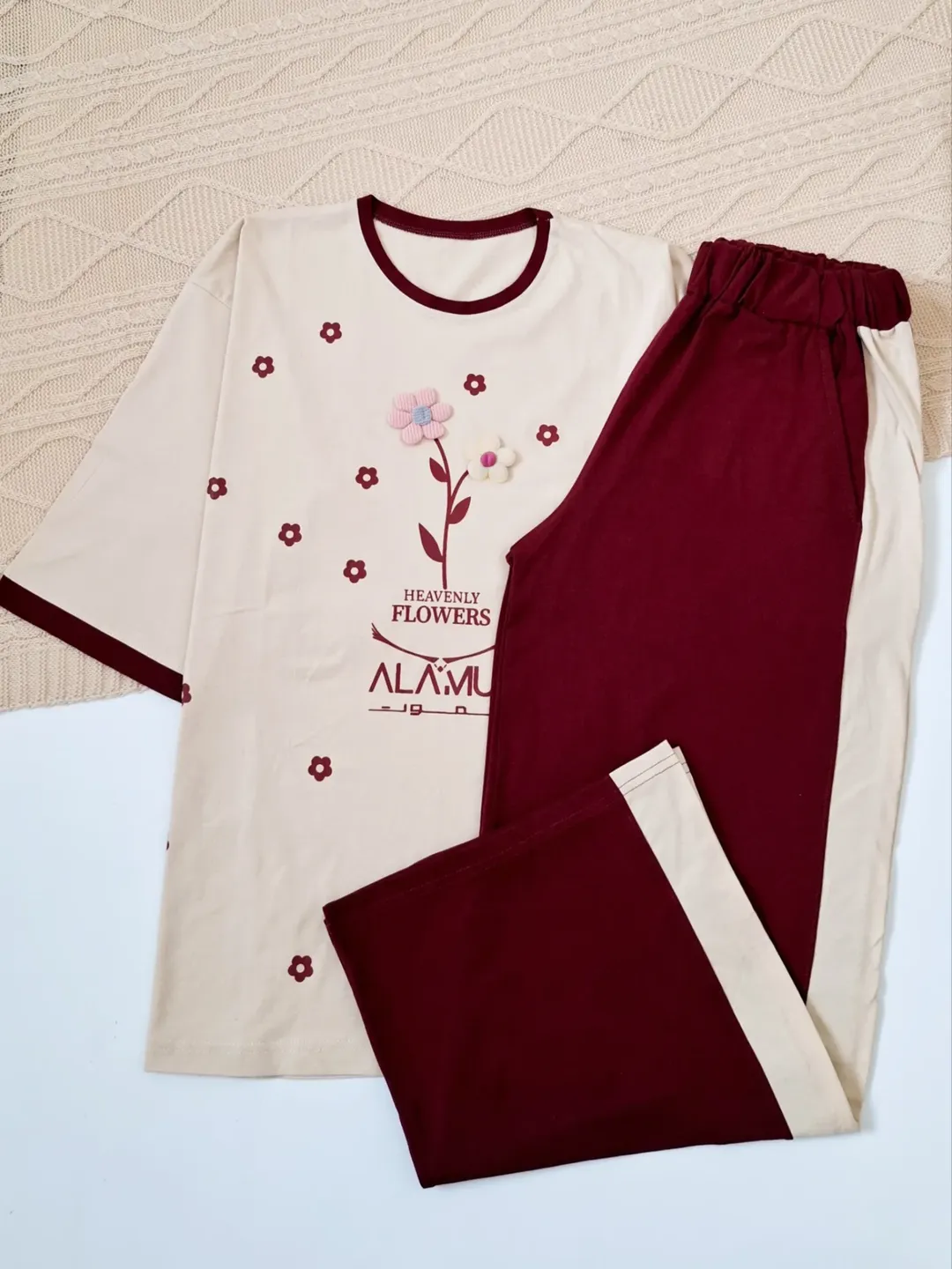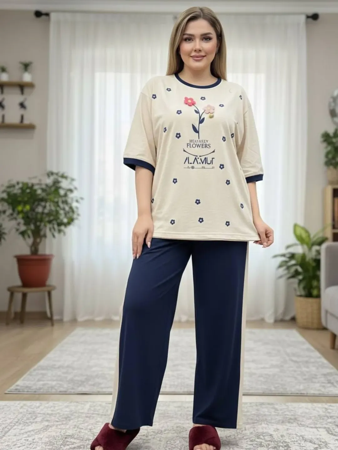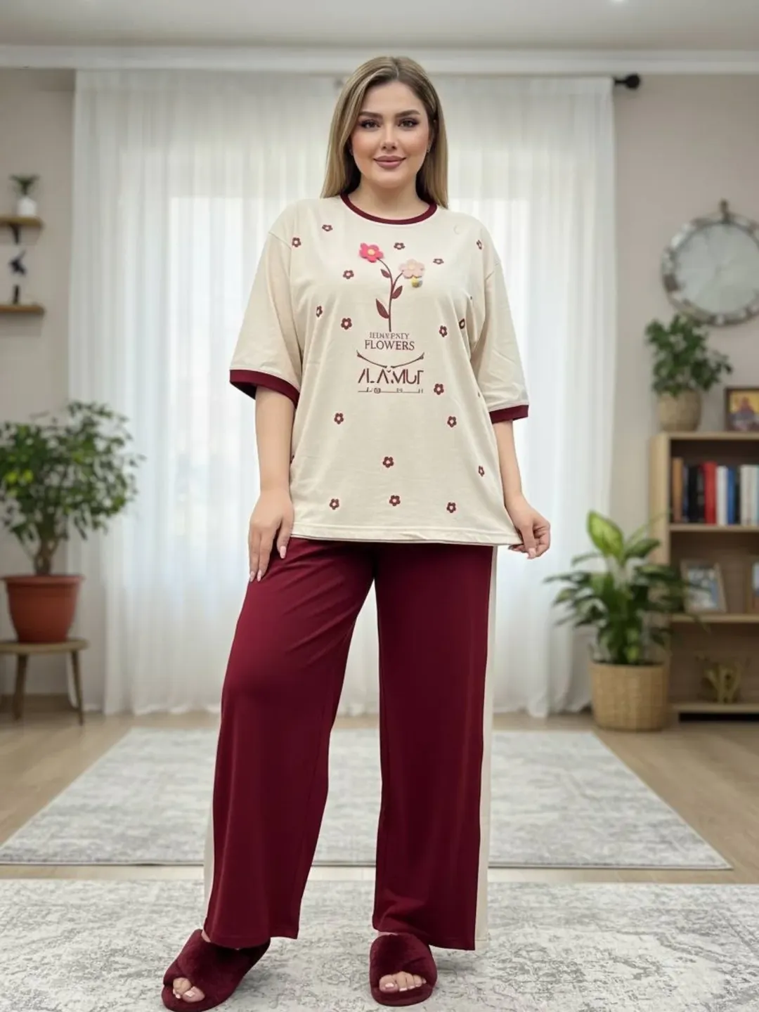 ست تیشرت شلوار گل برجسته زنانه مدل بگ جنس نخپنبه